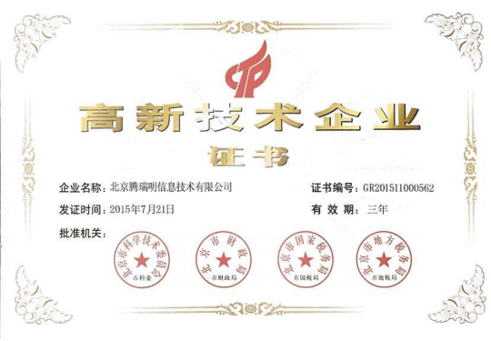 2015年7月21日,騰瑞明通過高新企業(yè)資質(zhì)復(fù)審,獲得了由北京市科學(xué)技術(shù)委員會(huì)、北京市財(cái)政局、北京市國(guó)家稅務(wù)局、北京市地方稅務(wù)局聯(lián)合批準(zhǔn)下發(fā)的高新技術(shù)企業(yè)證書。